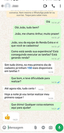 Nós somos uma plataforma que pode te conseguir uma renda extra, fazendo tarefas simples pelo celular, podendo chegar até a R$45,00 por hora! Posso te falar um pouco mais a respeito?
